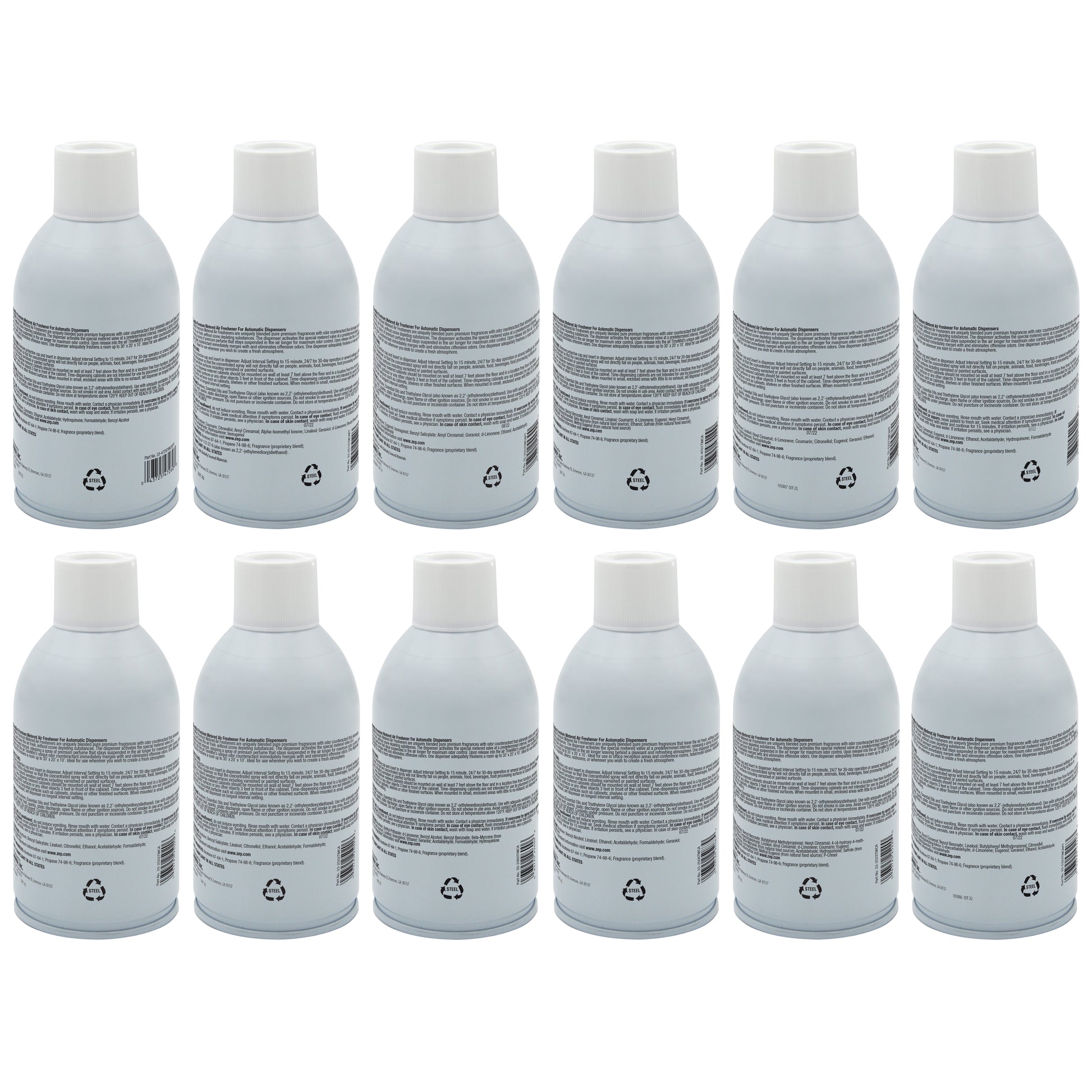 Experience a variety of fragrances with this mixed assortment. For use in all full-size TimeMistMetered Dispensers. Fragrance and odor counteractants in one can. Fragrances contain essential oils to ensure they are the longest-lasting and highest-quality fragrances. This automatic air freshener is a smaller, modern dispenser for all your odor control needs. It has a simplified user interface that allows for easy, flexible programming to customize your fragrance experience to 7.5, 15 or 30 min periods. Light, Dark, or both light sensor setting that ensures the dispenser runs only when needed. Operates efficiently for two years on four AA batteries (not included), refills sold separately. on the market. Refills last a full 30 days. 12/case.