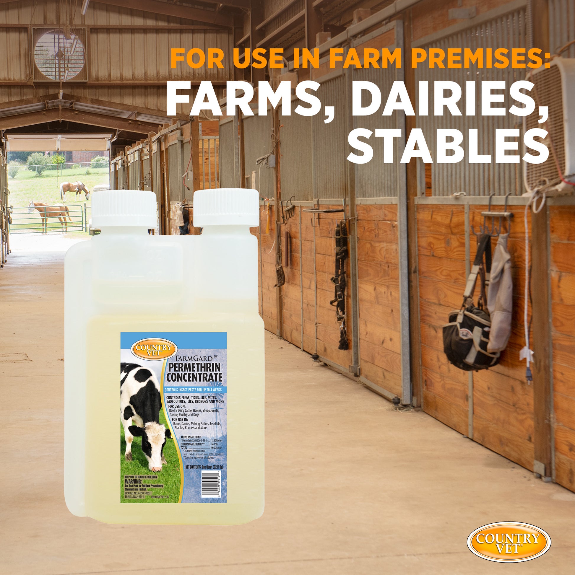 Country Vet Farmgard Permethrin Concentrate gets Rid of Flies, Mosquitoes, Silverfish, Cockroaches, Fleas, Millipedes, Gnats, Fruit Flies, Ticks, Lice, & Spiders with ease. Its effective formula controls pests for up to 4 weeks with a single application. It is an economical, broad-spectrum insecticide that is great for animal back rub, dog dip, premise spray or directly on an animal.?ß
