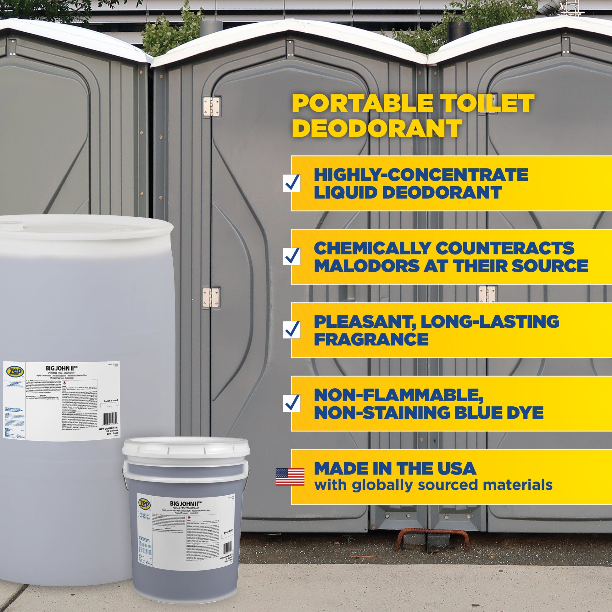 Zep Big John II is a highly concentrated portable toilet deodorizer that neutralizes foul odors and keeps portable restrooms fresh and clean. Its formaldehyde-free formula makes it ideal for construction sites, public events, buses, boats, and recreational vehicles. This water-based deodorizer quickly dilutes with water, creating a powerful solution that eliminates odors at their source. Biodegradable under normal sewage treatment processes and non-flammable, it disperses rapidly while protecting rubber and plastic components from damage.