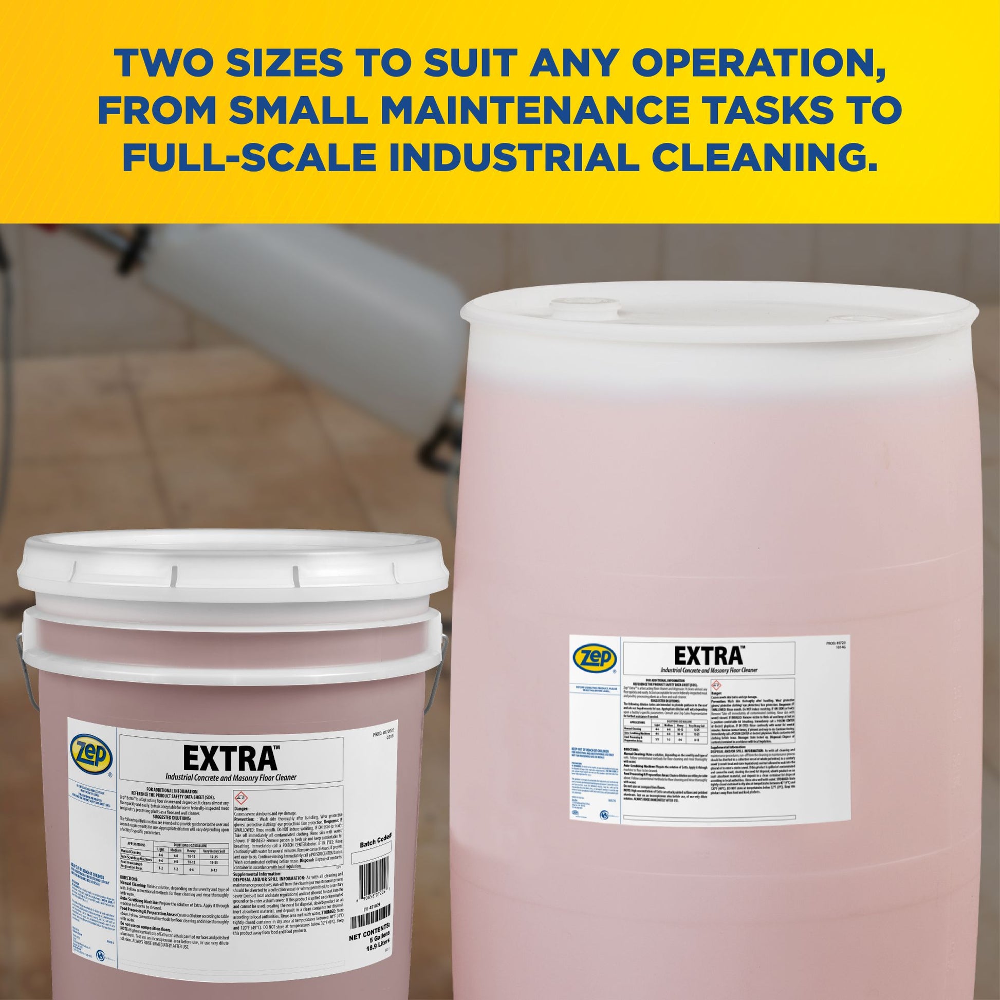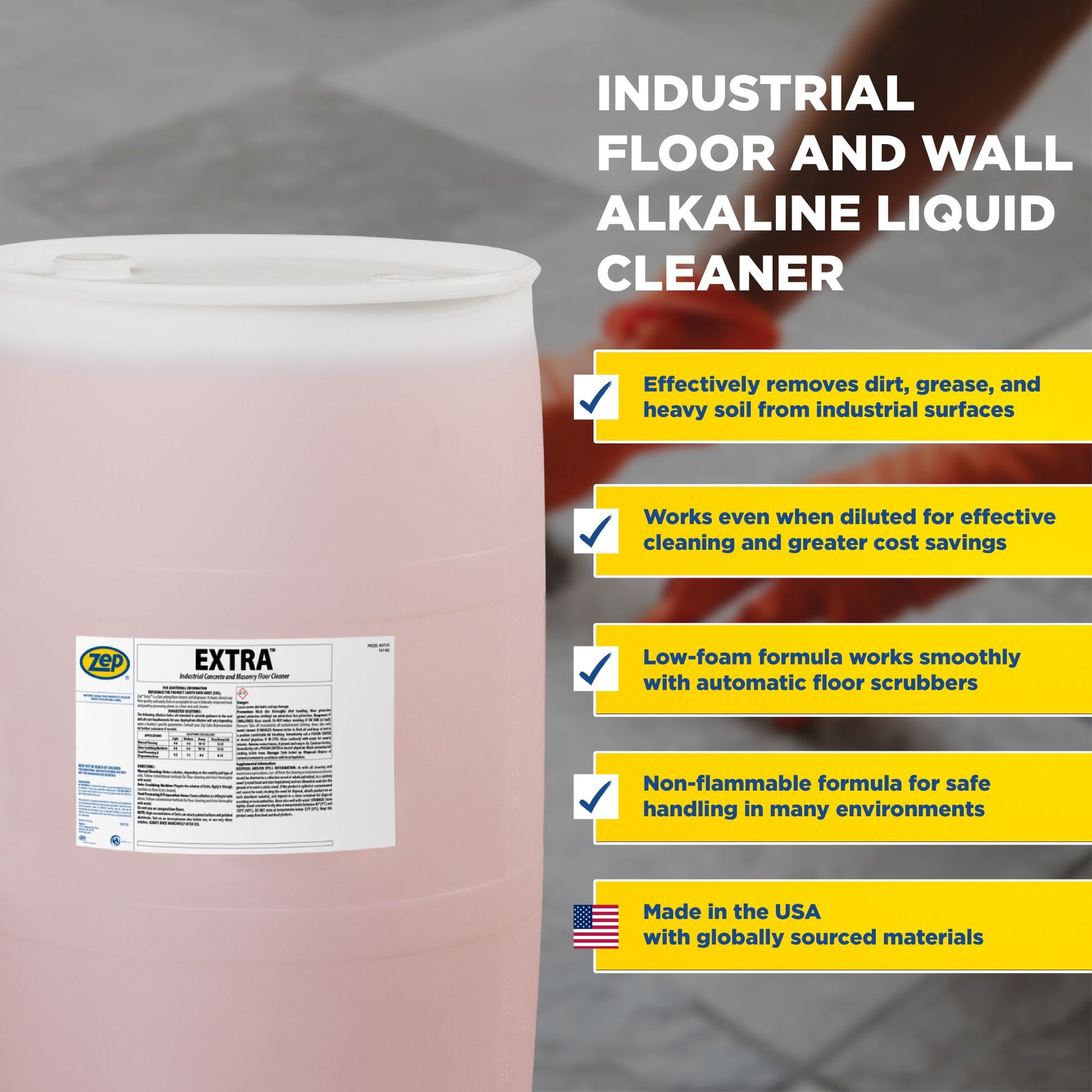 Zep Extra is a fast-acting industrial floor cleaner designed to remove dirt, grease, and heavy soil buildup from concrete and masonry floors. Its high-performance formula works effectively in manual cleaning, auto-scrubbing machines, and food processing/preparation areas, making it an essential cleaner for factories, warehouses, and commercial settings. This cleaner is approved for use in federally inspected meat and poultry processing plants and ensures floors are cleaned quickly and efficiently without leaving residue.