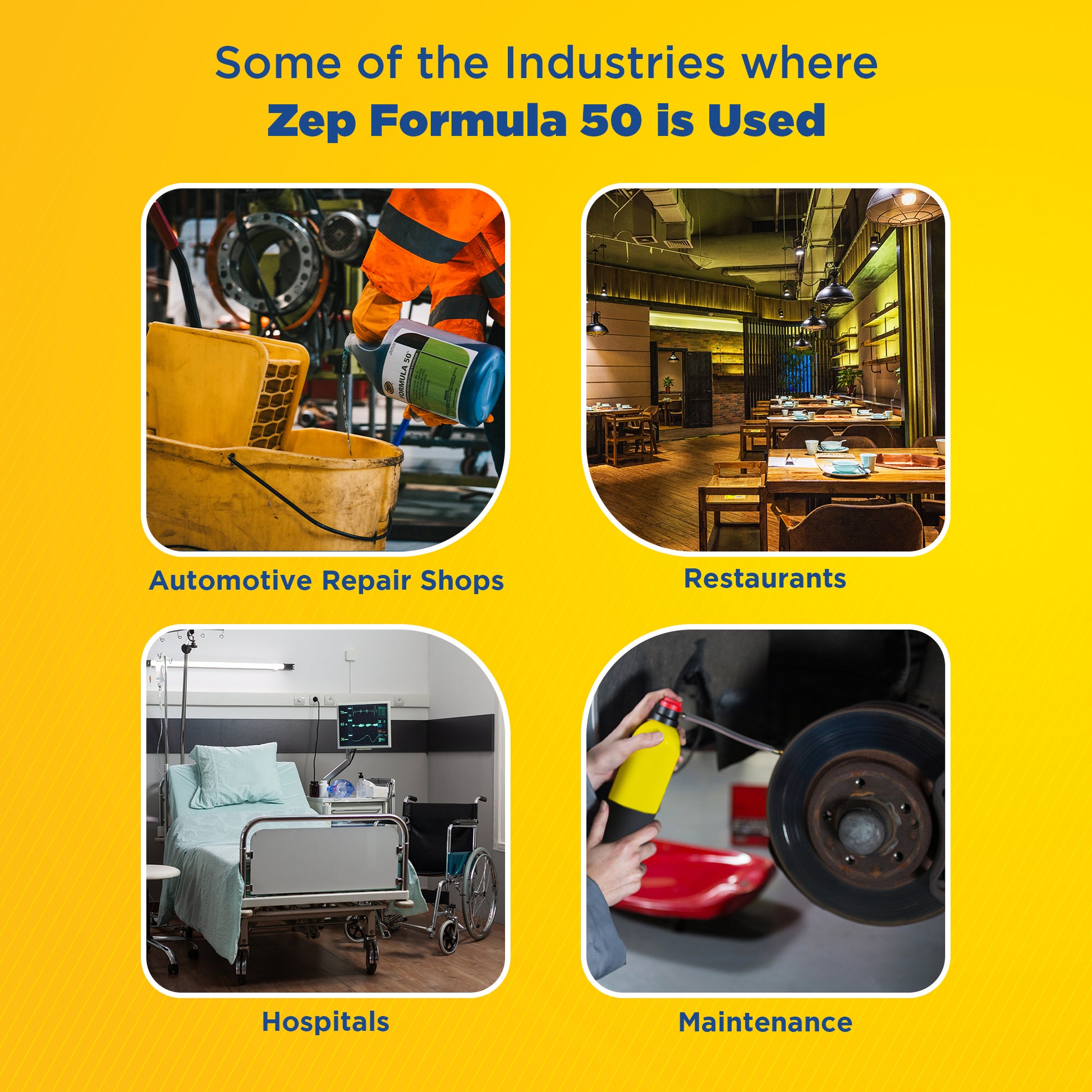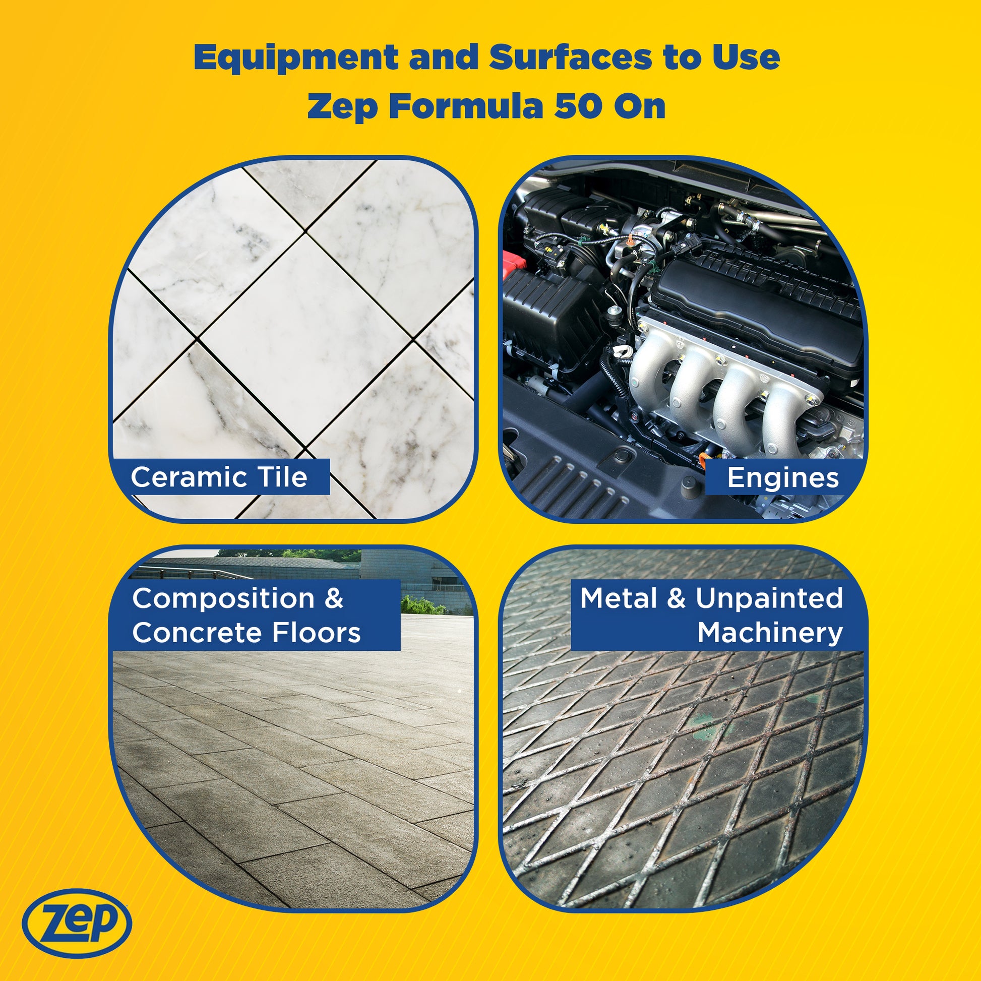 This concentrated product must be diluted as directed prior to use. For Floors: For composition cleaning, dilute 1 part Zep Formula 50 with 10 to 20 parts water and scrub floor in usual manner. Rinse floor thoroughly. For terrazzo and ceramic tile cleaning, dilute 1 part Zep Formula 50 with 10 to 40 parts hot water, scrub floors in usual manner, and rinse. For concrete cleaning, dilute 1 part Zep Formula 50 with 8 to 20 parts water, depending upon soil. Scrub thoroughly and rinse. For automatic scrubbing machines, use 3 oz. of Zep Formula 50 per gallon of water for general cleaning. For heavy-duty cleaning, degreasing of concrete, and wax stripping, use 6 ounces of Zep Formula 50 per gallon of water. For steam cleaning machines for equipment, dilute 1 part Zep Formula 50 with 10 to 30 parts water, depending upon degree of soil. For Unpainted Machinery and Equipment (including tool and die stamping machinery, newspaper presses, linotype machines, bottling equipment, textile machinery), dilute 1 part Zep Formula 50 with 8 parts water. Apply by spraying, wiping, or brushing. Dilution with hot water will increase cleaning power of Zep Formula 50. Allow solution to soak on machinery for two or three minutes and then wipe dry with clean cloth or rinse with water. For Degreasing Automobile Engines, dilute 1 part Zep Formula 50 with 8 parts hot water. For very greasy surfaces, allow to soak 15 to 20 minutes before rinsing with a strong stream of water. For Whitewall Tires, dilute 1 part Zep Formula 50 with 8 parts water. Spray solution on tires and allow to remain on surface approximately one minute. Rinse with a strong stream of water. Stubborn spots may need brushing. Note: High concentrations of Zep Formula 50 can attack painted surfaces and polished aluminum. Test on an inconspicuous area before use or use very dilute solution. Always rinse immediately after use, especially on glass surfaces.