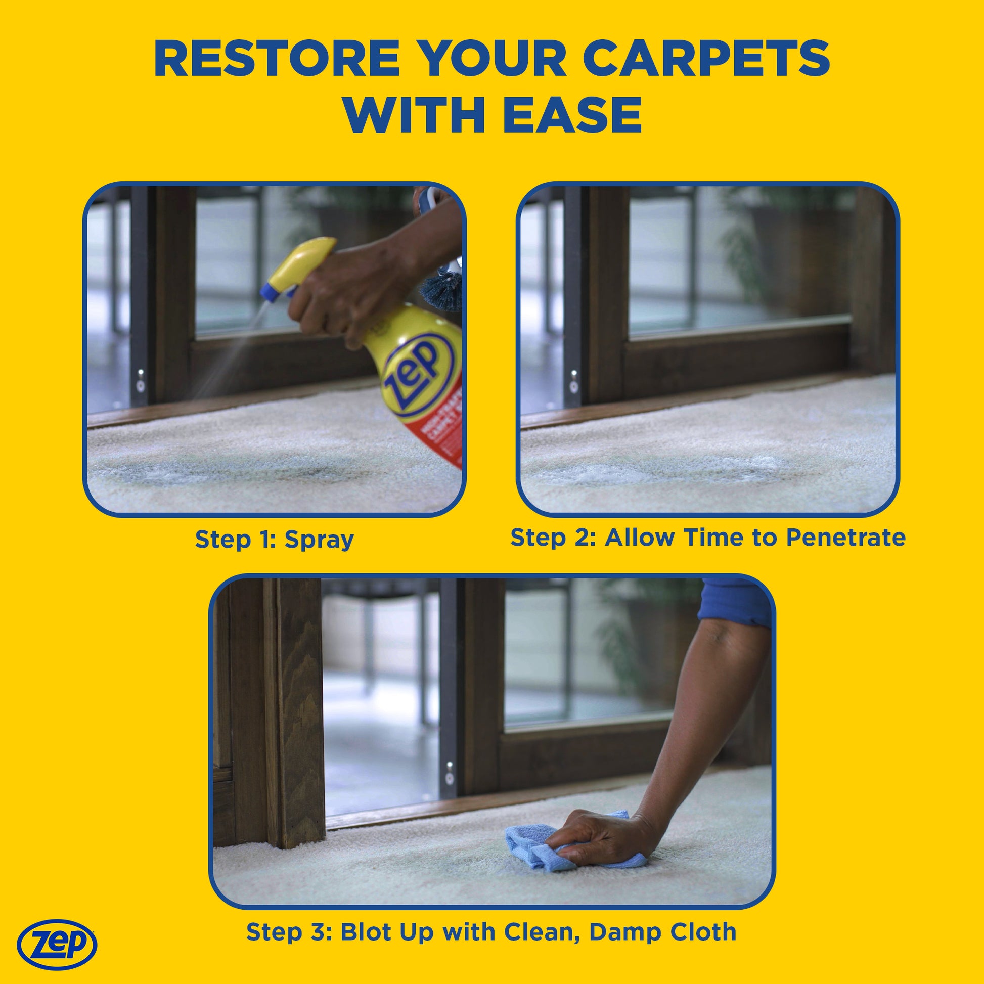 Always test first in an inconspicuous area to insure color stability of the carpet. FOR HIGH TRAFFIC AREAS: Clean carpets in 3 ft. square sections. After spraying area to be cleaned, use a clean, damp cloth to blot stains until carpet is dry. FOR SPOT CLEANING: Use a clean cloth to blot excess spill. Spray the spot. Wait a few minutes; then blot clean with a damp sponge or cloth. For ground-in stains, use a brush to loosen dirt before applying product. FOR SEVERE ODORS: Spray this product and saturate the carpet. For the enzyme action to work best, cover the spot with a damp towel for several hours or overnight until odor is gone. Remove all pets from treated area until completely dry.