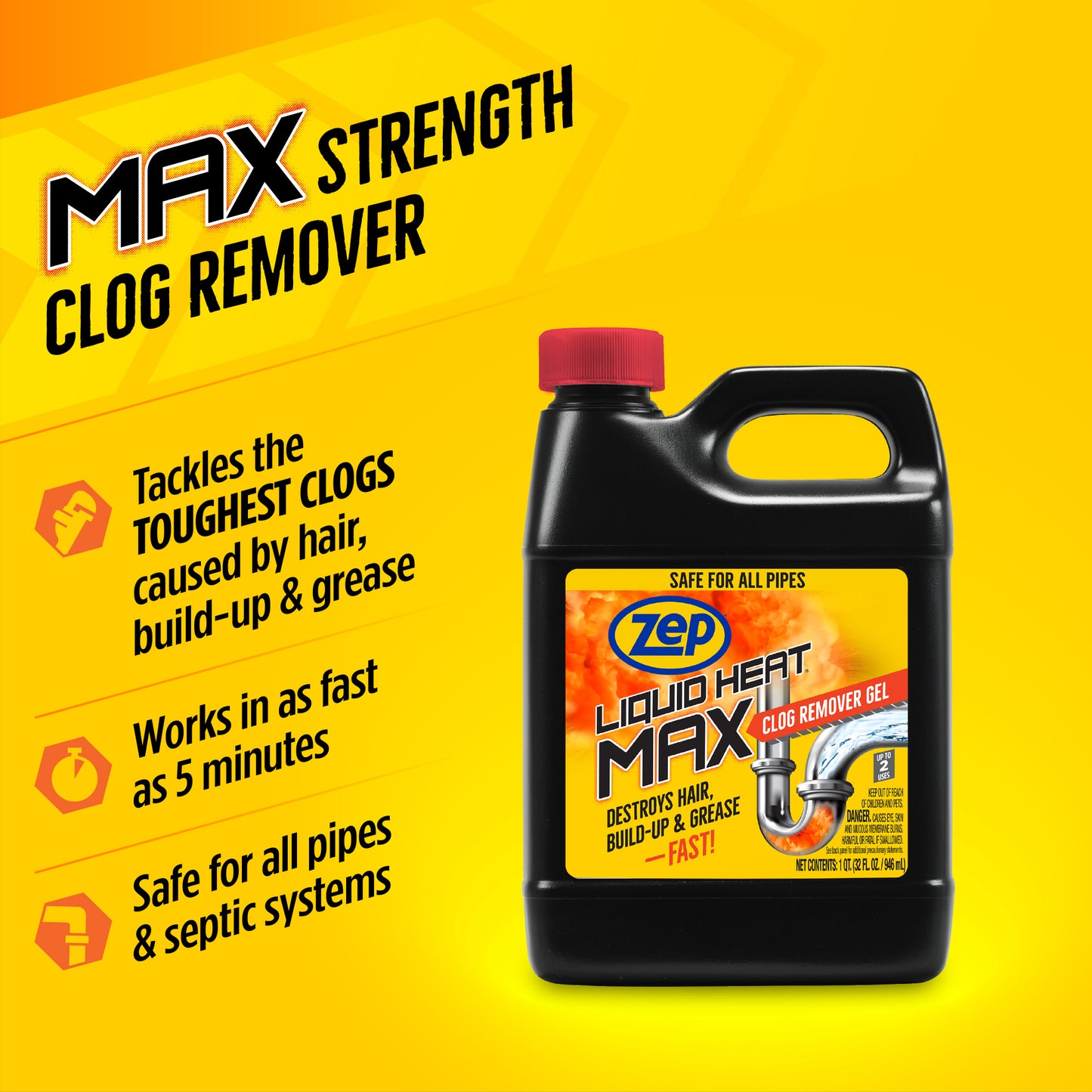 Engineered for maximum effectiveness, Zep Liquid Heat Max Clog Remover Gel blasts through hair, grease, and buildup—the most common causes of household clogs. The professional-strength formula cuts through standing water and clings to debris for superior penetration and clog-busting power. Safe for use in all types of pipes and septic systems, it’s ideal for bathroom sinks, tubs, showers, and kitchen drains. Whether you're dealing with a slow drain or a complete backup, trust Liquid Heat Max to restore flow quickly and safely—without damaging plumbing or calling a professional.