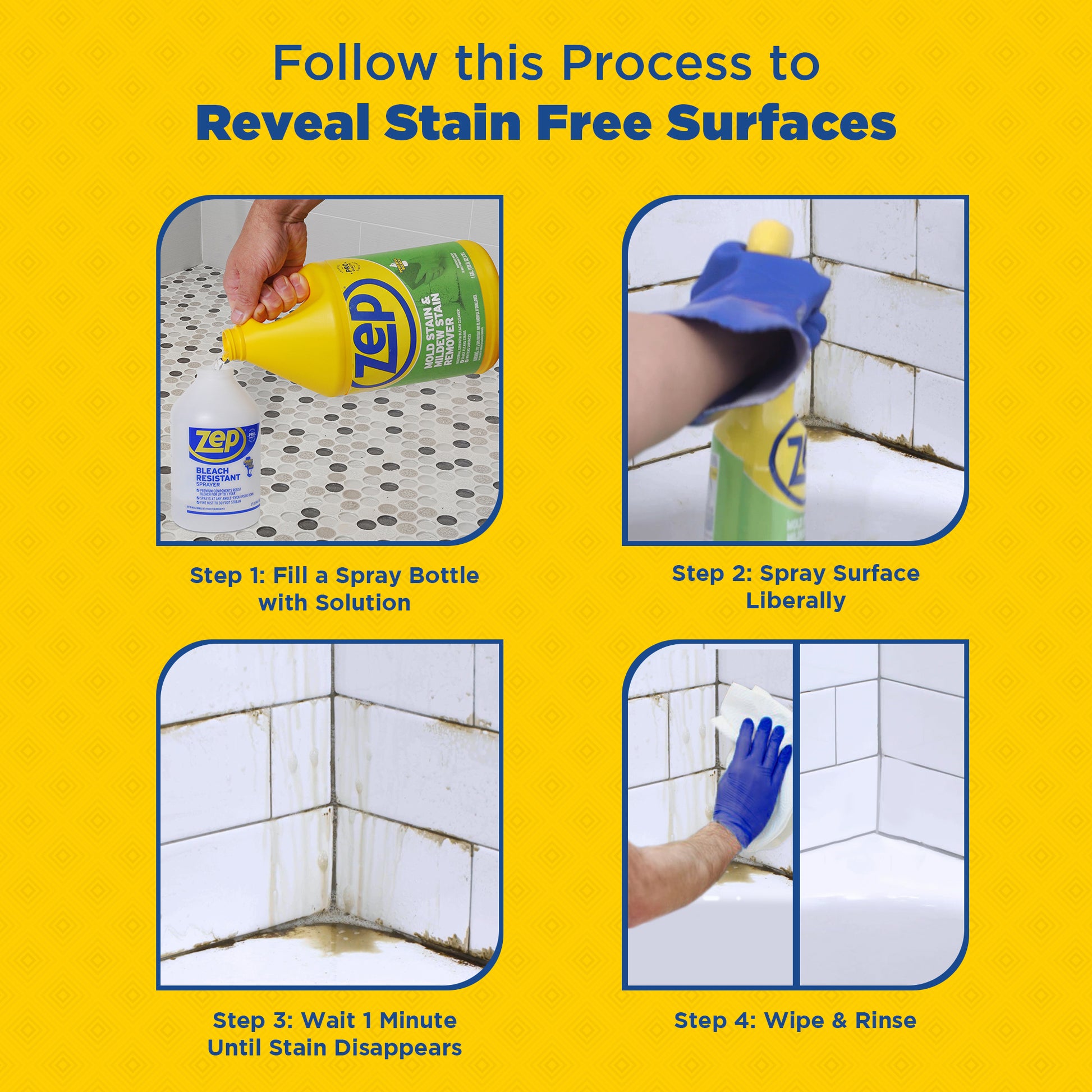 Zep Mold Stain and Mildew Stain Remover is a powerful, industrial-strength mold stain remover and mildew stain remover designed to quickly dissolve tough stains. This bleach-based, ready-to-use mold stain treatment spray works effectively both indoors and outdoors in 1 minute to clean without scrubbing.