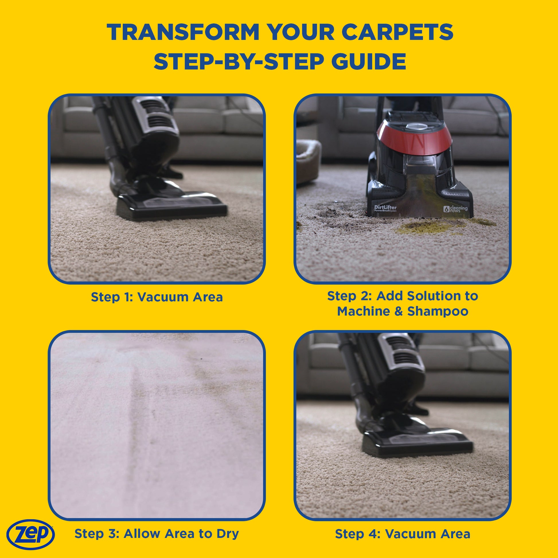 Vacuum area, add solution shampoo with machine, allow area to dry, vacuum. Follow carpet cleaning machine manufacturer’s instructions. Most machines do not require diluted concentrate; use at full strength if directed. For machines requiring pre-diluted formula, follow instructions or use 5 oz. per 1 gallon of warm water. Shampoo carpet with machine. Allow area to dry. Vacuum.