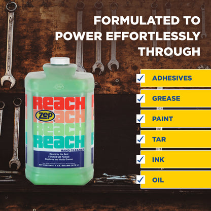 Zep Reach Hand Cleaner is trusted by professionals to deliver effective, gentle cleaning for tough industrial soils. This industrial hand cleaner combines solvents, detergents, and pumice to easily clean hands. Zep Reach is also phosphate-free and contains emollients, meaning that it is milder on skin than standard heavy duty industrial hand soaps.- Heavy-Duty Performance: Removes grease, grime, ink, resins, tar, carbon, and adhesives, making it a reliable industrial hand cleaner.